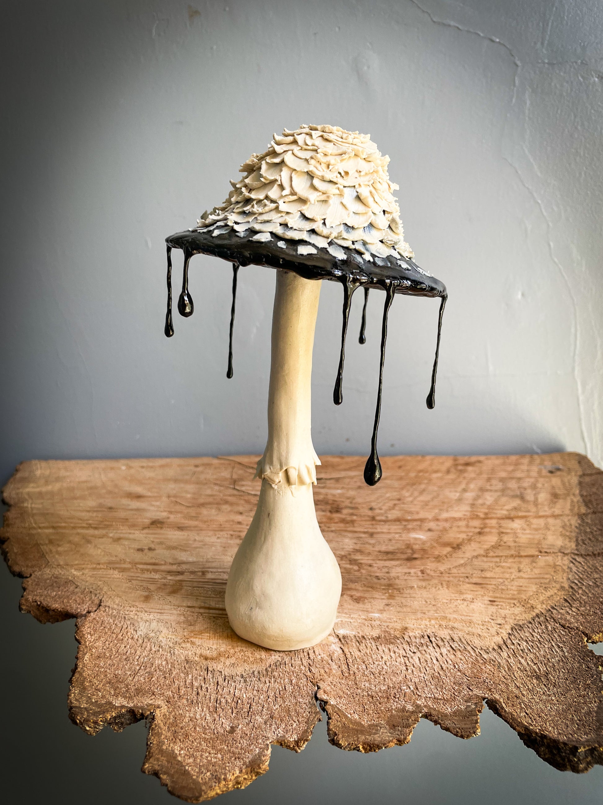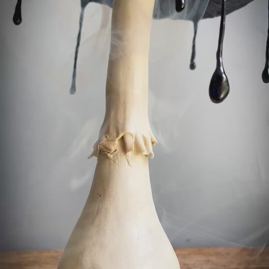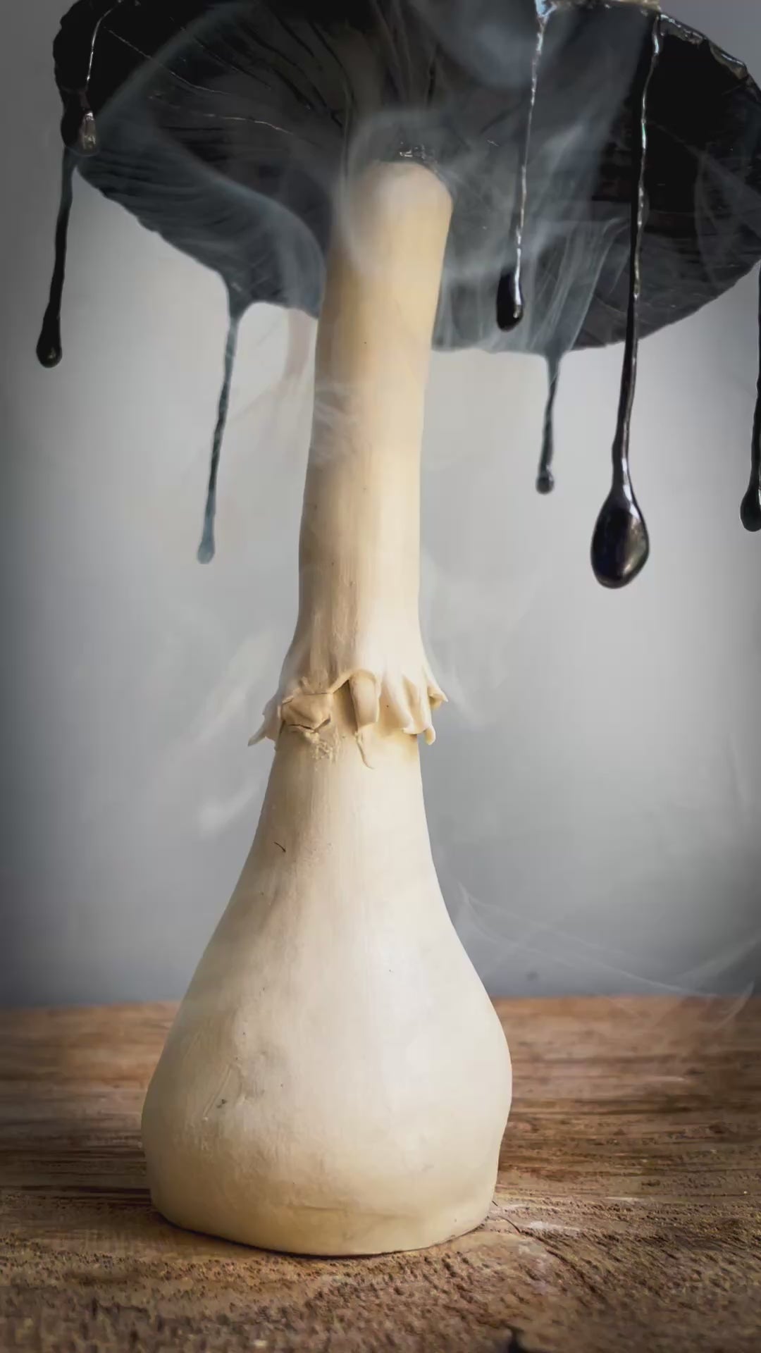 The ones that went viral ! The shaggy ink caps. These burners were made as botanically accurate as I could achieve. When the incense starts to burn, the smoke imitates the natural spore dispersal of an amanita . The burner is made out of stoneware ceramic and glazed by hand . The longer drips consist of clay E6000 industrial strength adhesive and wire. The longer drips are bendy and impact resistant so they last ! This incense burner takes cone style incense 🖤